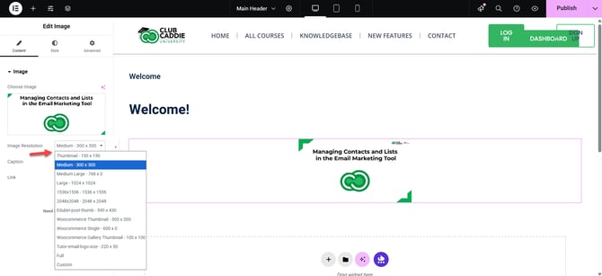 In the Content tab, use the Image Size dropdown to choose a preset size such as Medium, Large, or Full, or select Custom to enter an exact width and height in pixels. Use the Alignment options (Left, Center, or Right) to position the image within its column.