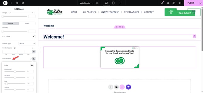 In the Style tab, locate the Box Shadow controls. Turn them on and adjust the color, blur, spread, and position to add a subtle drop shadow that gives the image more depth on the page.