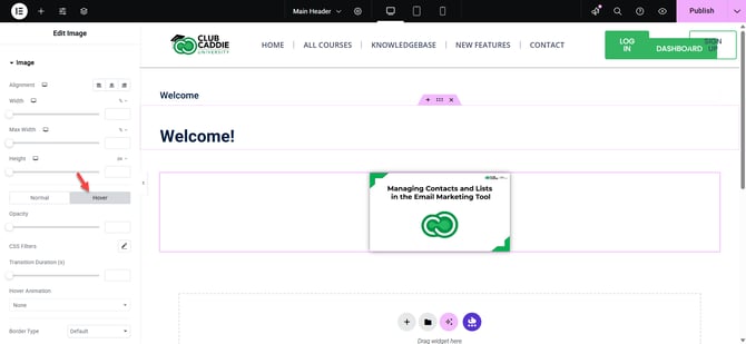 Still in the Style tab, switch to the Hover state (often labeled Hover or under Style > Hover). Choose a Hover Animation such as Grow, Shrink, or Fade, and adjust Opacity or CSS Filters (like brightness or blur) to create a simple interactive effect when visitors move their mouse over the image.
