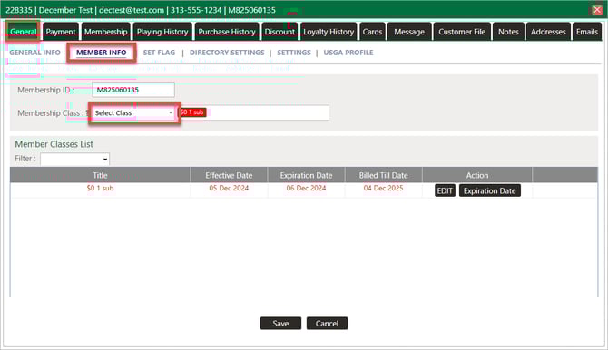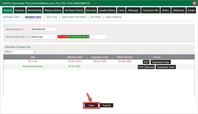Step 5: A newly assigned member class will now show in the Member Classes List section. Click on the Save button to save the changes for the customer.