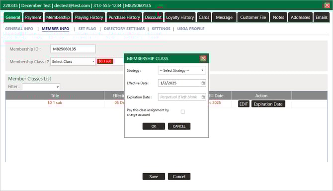 Step 4: The system will open a MEMBERSHIP CLASS window containing the Effective date and Expiration date, and an option to pay this class by charge account.