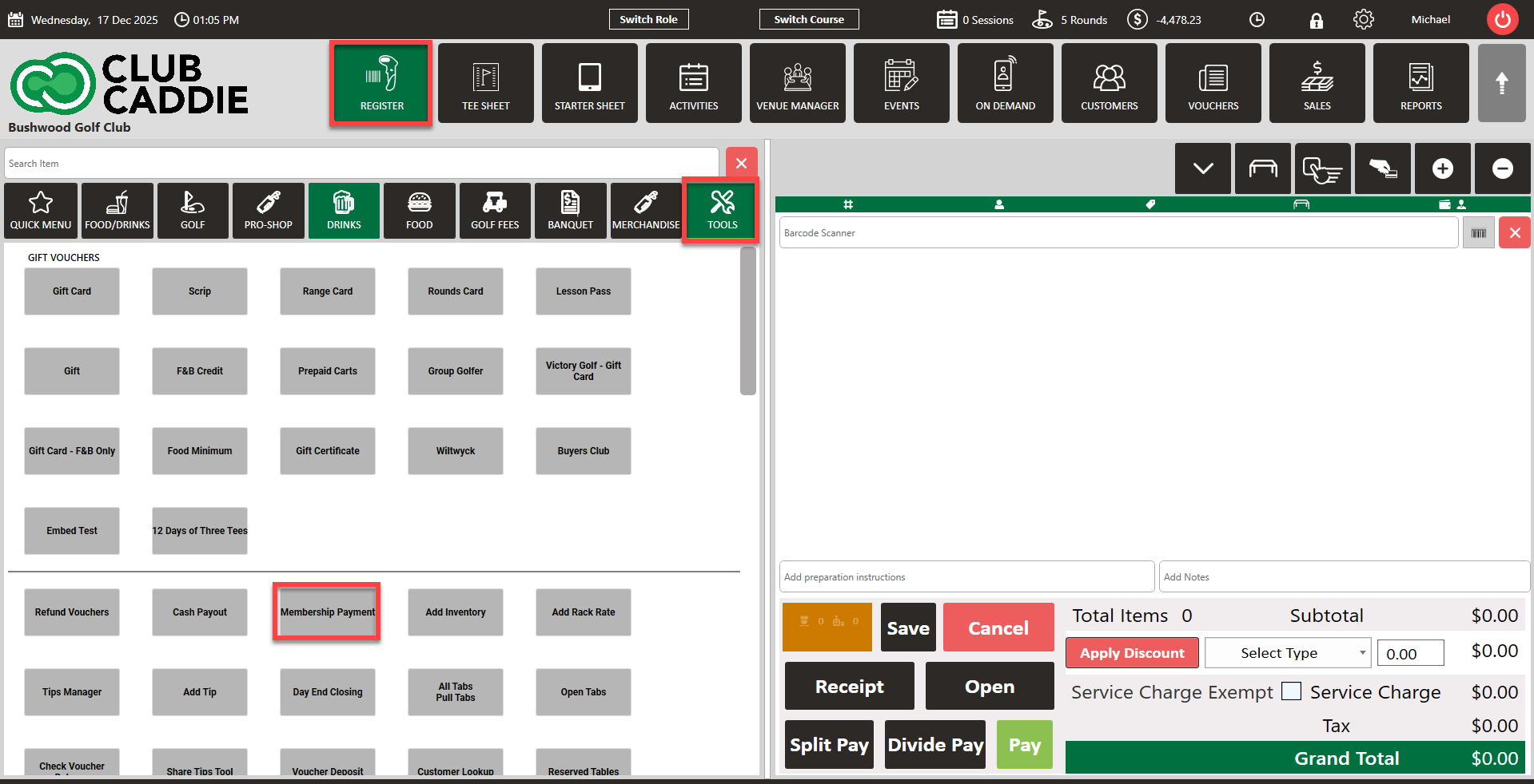 If you need to take a payment, you will do so in the Register module. From there, you will select Membership Payment under the Tools section. If you need step by step instructions, please CLICK HERE for the article on Membership Payments.