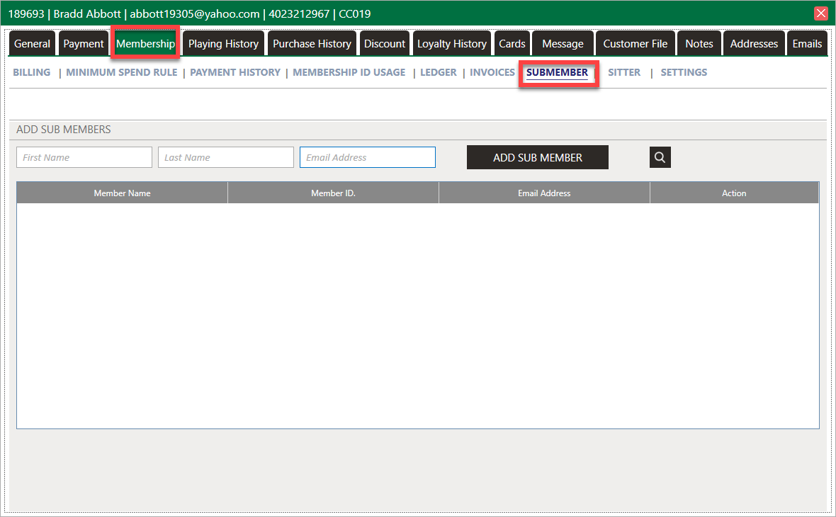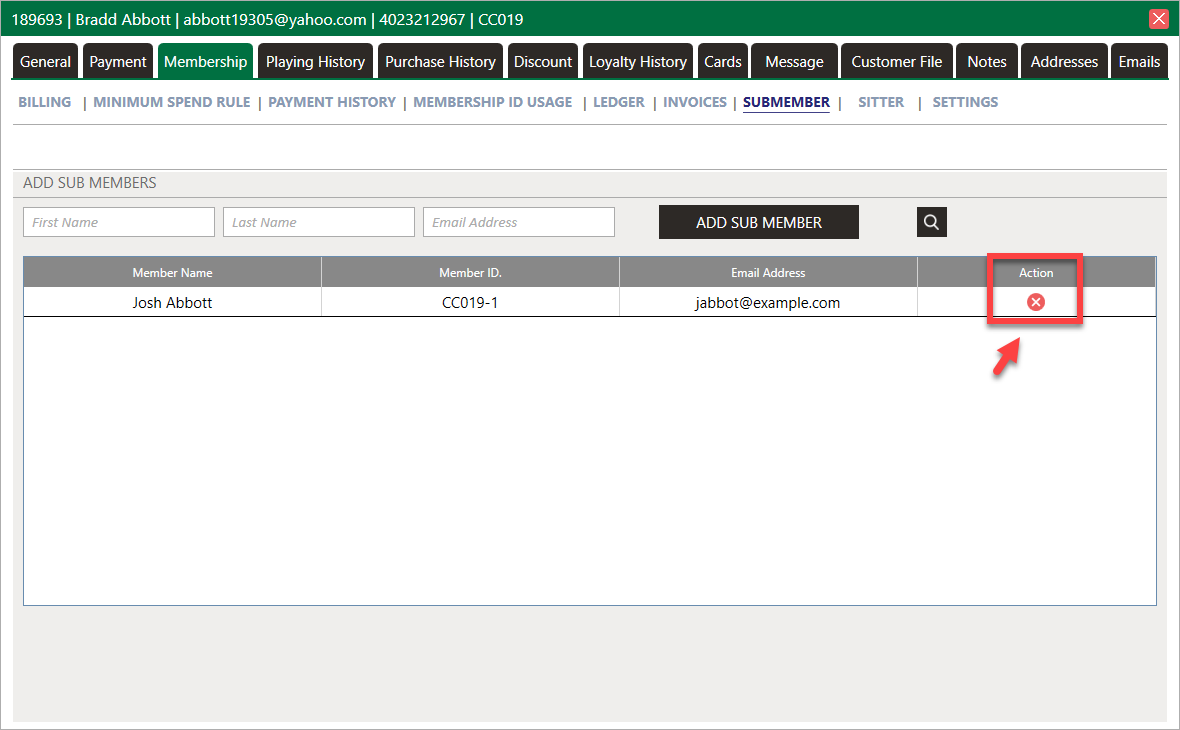 Step 4: In the CUSTOMER PROFILE window, select SUBMEMBER under the Membership tab. Enter the necessary info then click ADD SUB MEMBER. To delete the sub-member, click the red "x" and the sub-member will be get deleted.