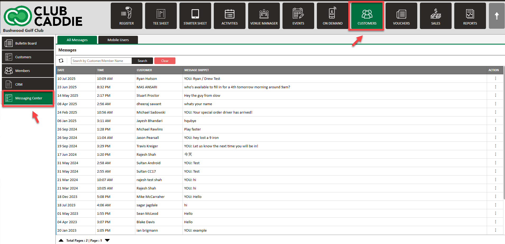 In Club Caddie, there are two primary methods to send messages to your customers: directly from the tee sheet or via the Messaging Center. Each option is outlined in Steps 1 and 2 below.