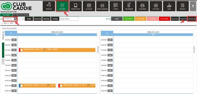 Step 1: To email players scheduled on the tee sheet for a specific day, navigate to the Tee Sheet module, select the desired date, and click Send Email.