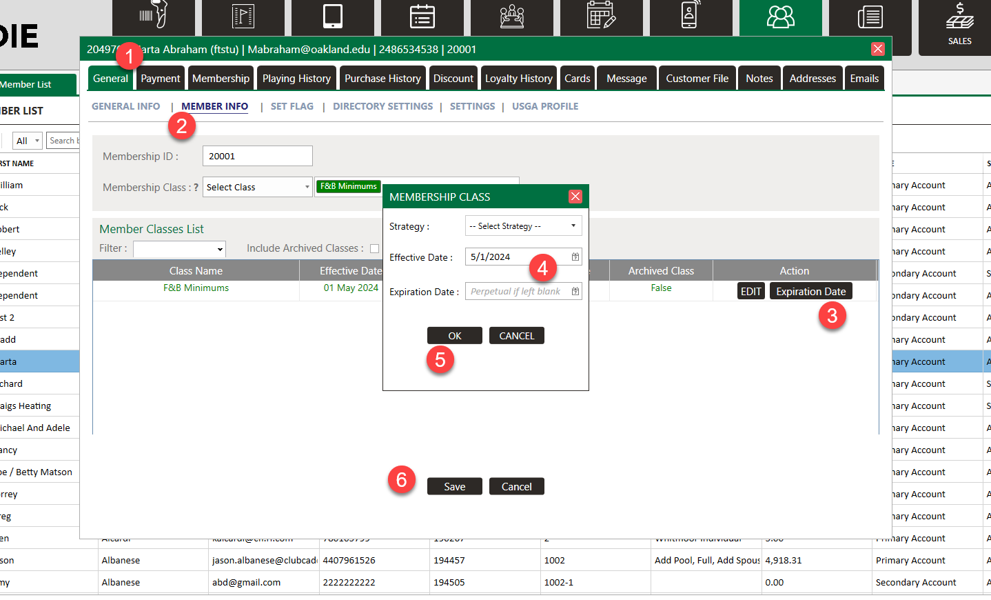 1.2 Under the General tab, click on Member Info. Under Action for the class you wish to expire, click on Expiration Date to generate a Membership Class pop-up. Set to today’s date or the desired end date. Click OK to confirm. The expired member class will now show in the Member Classes List section. Click on the Save button to save the changes for the customer.