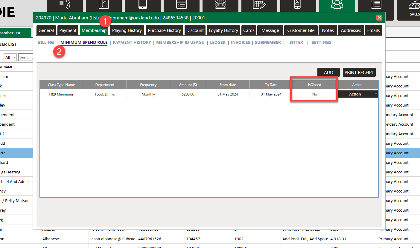 2.1 If the membership has minimums associated with it, navigate to the Membership tab in the CUSTOMER PROFILE window. Select the Minimum Spend Rule tab in the sub-menu, and verify if there are any active minimums. The most recent cycle will show a No under the Isclosed column if the minimums are still active.