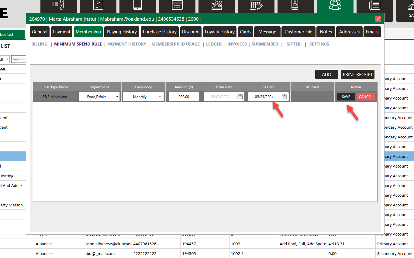 Completing these steps will successfully end a membership by expiring the membership class, expiring any minimums, and removing charging privileges.