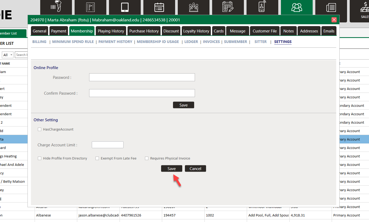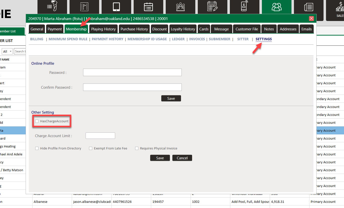 3.1 On the members profile, Select the Membership tab, and then click on Settings in the sub-menu. Locate the Has Charge Account option and disable it (unchecked) to remove the member’s ability to charge amounts to their account.