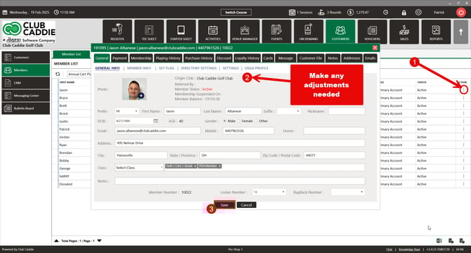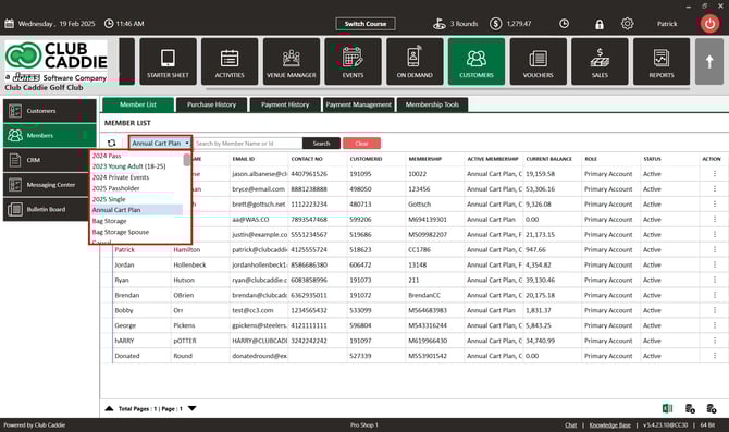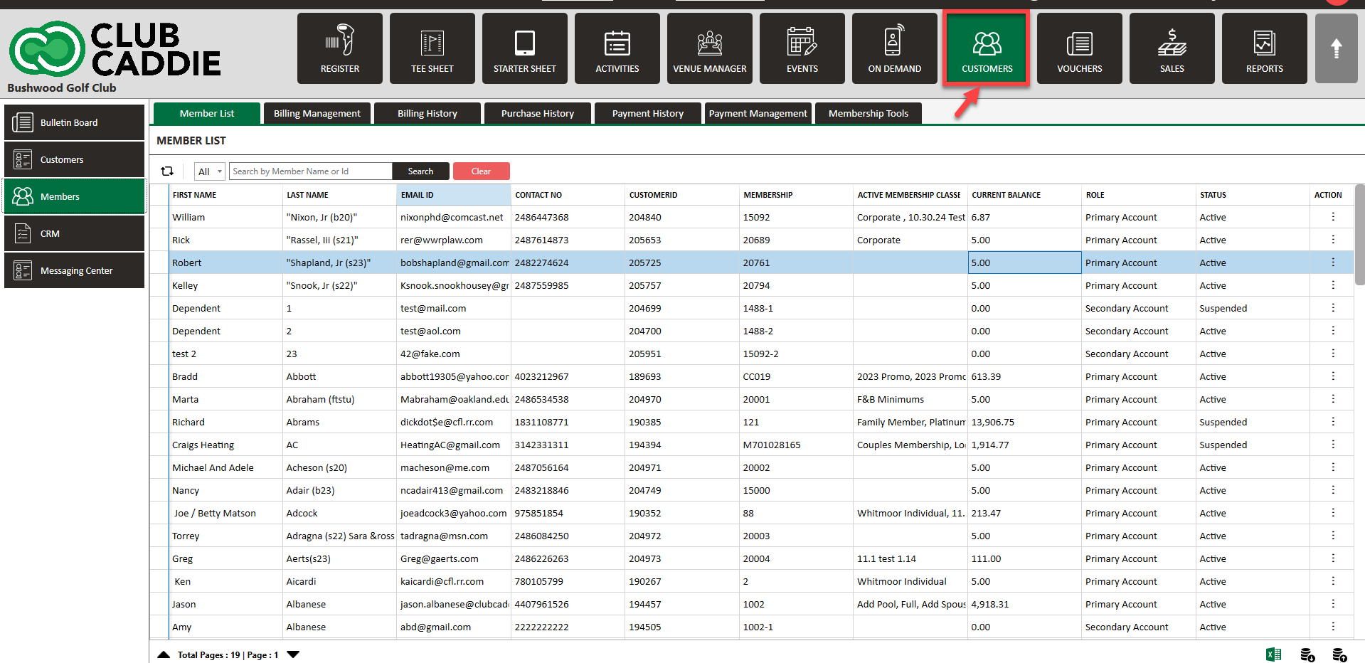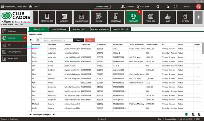 Step 2: Click on the Members button on the left side of the window to go to the member list. The Member List window shows all the members created for the Golf Course. Use the Customers header tab to add new members. Please refer to the article on the Customers header tab for more details.