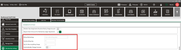 - Monthly Billing Day: This is the day invoices are generated for past months bills. If that day is the 21st of November then it covers October 21st - November 20th. Invoices will be sent to members if the setting for auto email invoices is turned on.