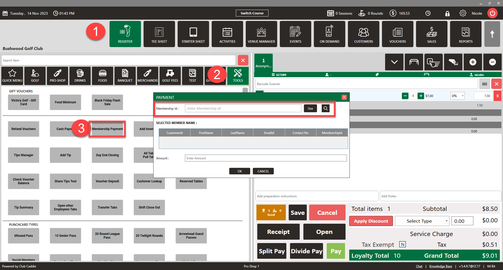 - To make a manual payment please go to Register → Tools → Membership Payment. Select the member, enter the amount, and finalize the payment.