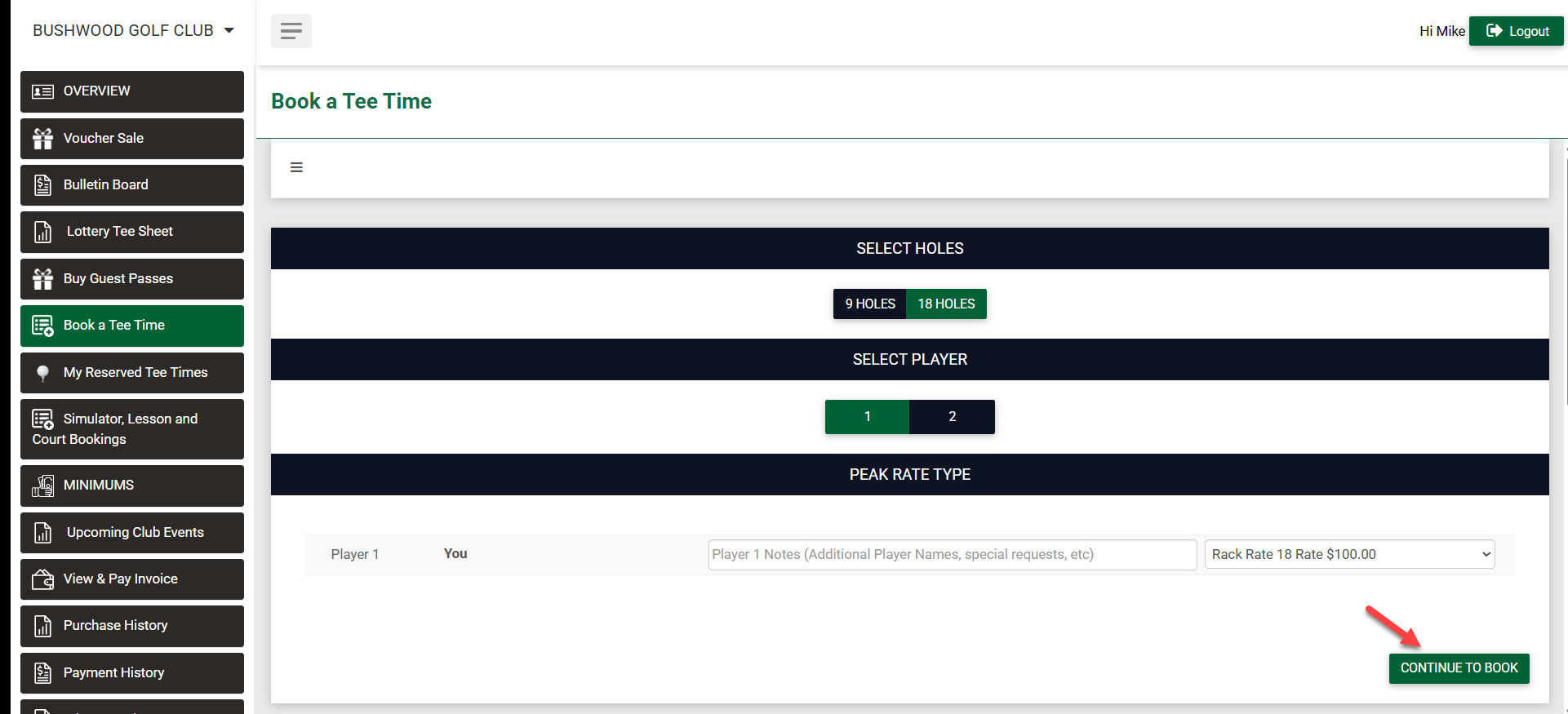 Step 4:Select number of holes, select number of players, and pick the rate type for booking. You can add special request as a note. Then click on "CONTINUE TO BOOK".