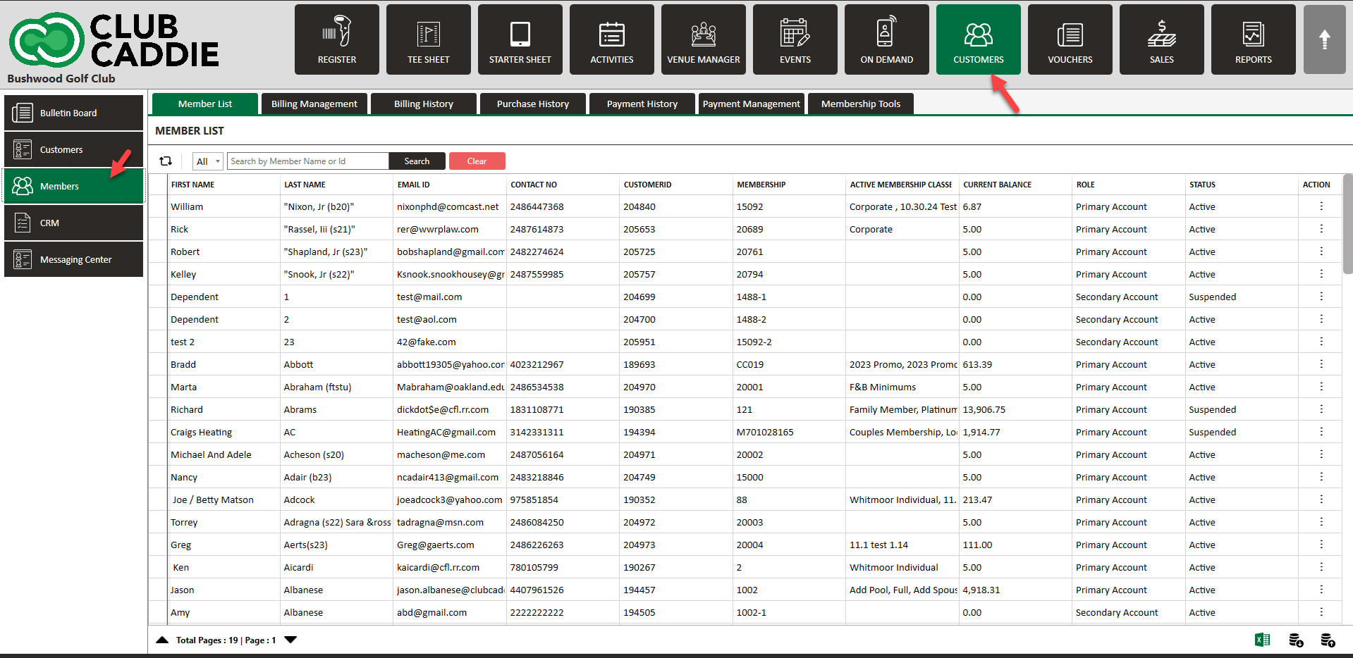 Step 1: Click on the "Customer" button at the top of the screen. Click on "Member" from the right corner of the screen. You can see the list of members then double click on a member to populate their profile.