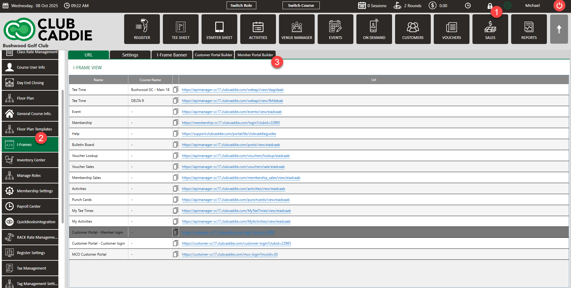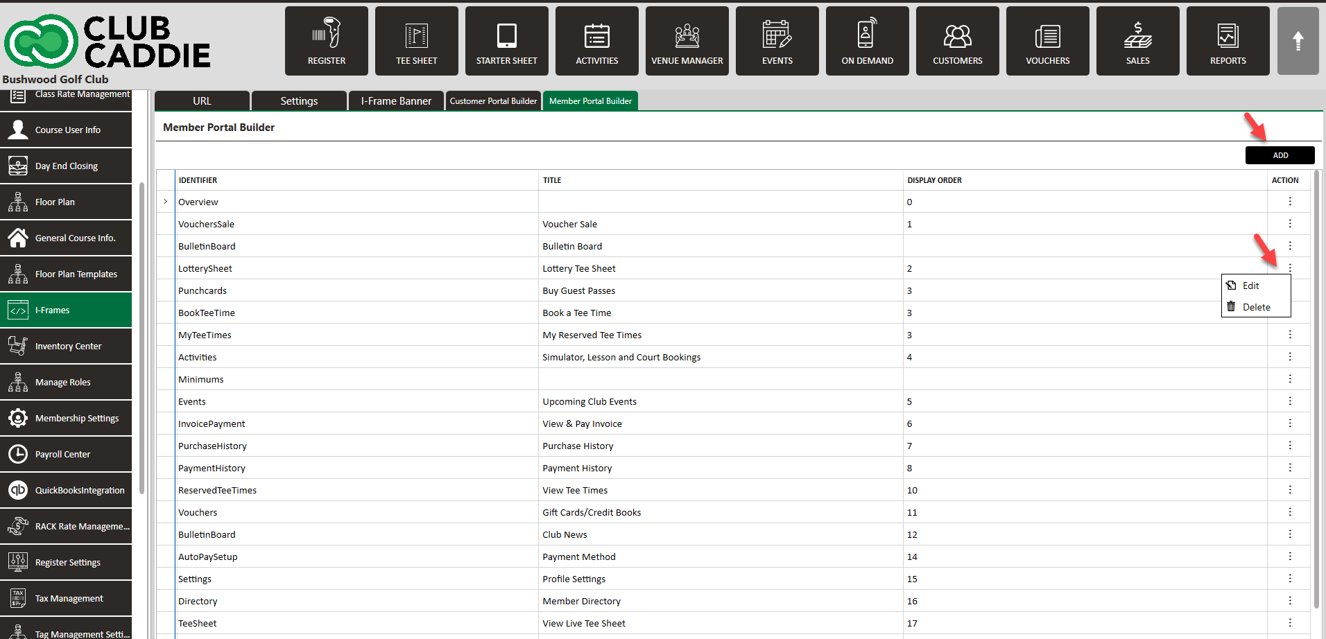 Step 3: Click on the Gear wheel Icon on the top right corner of the screen. Click on "I-Frames" in the right corner of the screen, then you can see the Membership portal link and click on it. Here you will be able to add/delete what options you will like to have your members to have on the member portal.