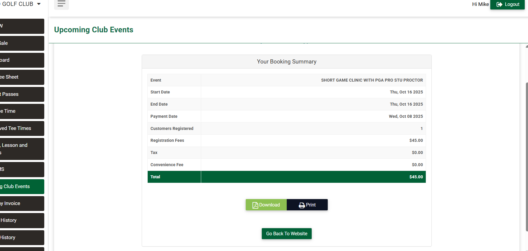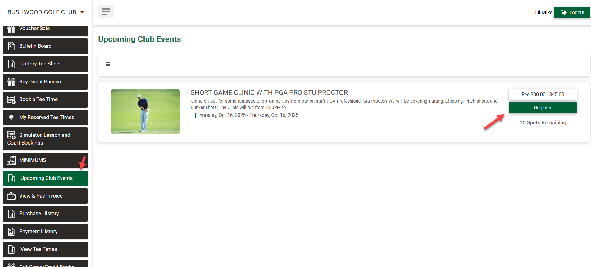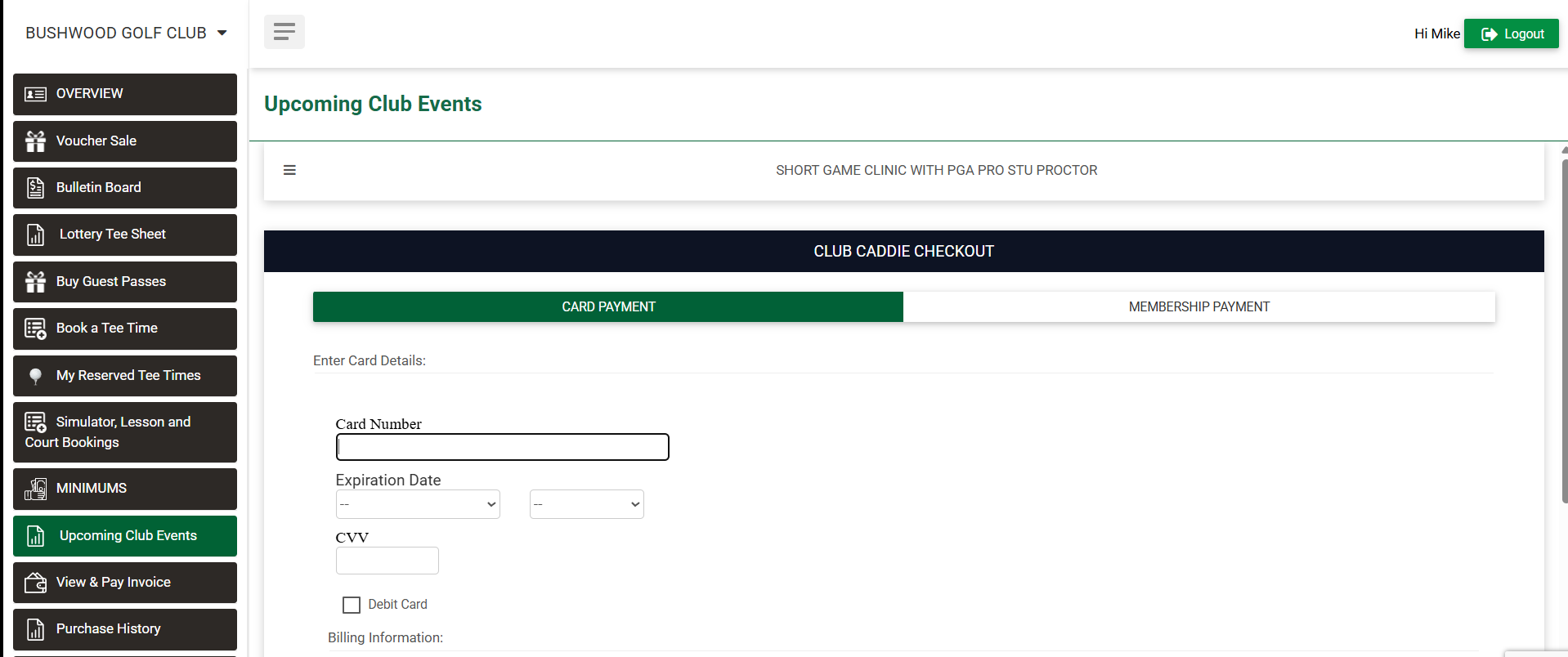 Step 6: Once a member has signed in, they can see the "Events" option on the right of the screen and click on it, so that they can see the available Event on the screen and then click on "Register". The member will get “Card Payment” and “Membership Payment” options on the screen, then complete the process and click on “Submit Payment” on the screen below.