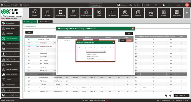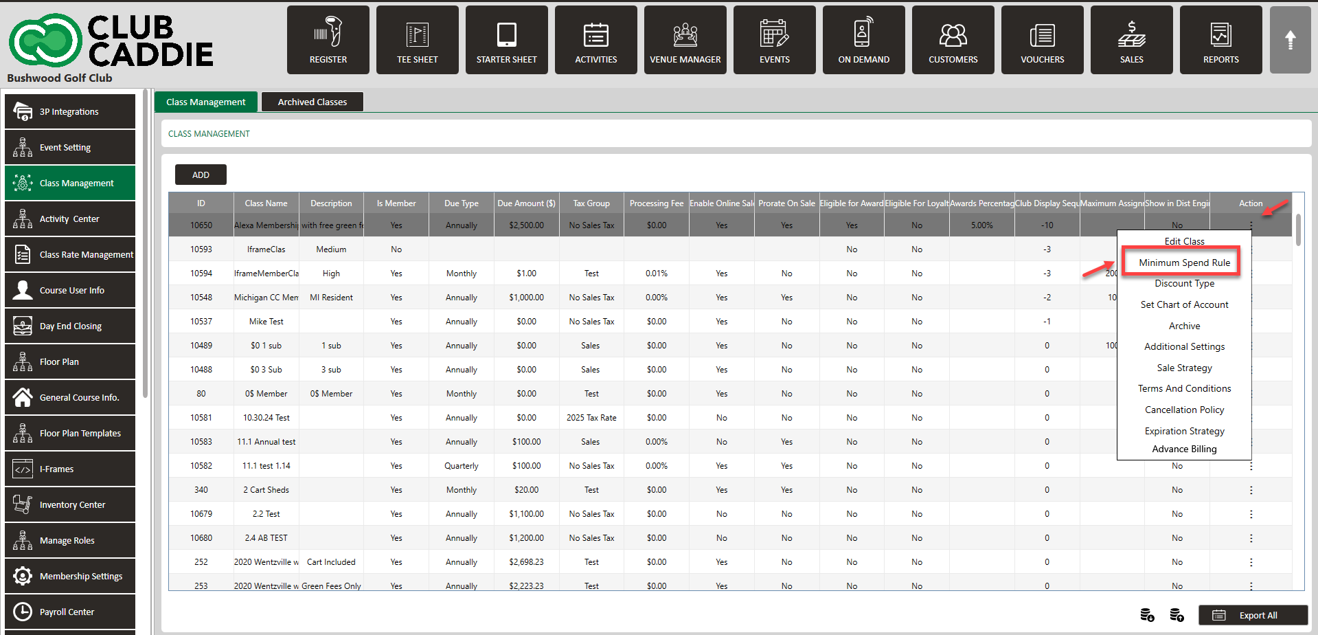 Step 2: Select the Class Management from the left row of the window. To apply the Minimum Spend Rule, select the Minimum Spend Rule from the Action button's drop-down list.