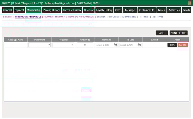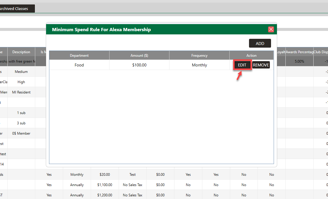 Step 3: The system will generate a new Minimum Spent Rule window. Click on the Add button then select the department from the Drop Down for which department you want to add Minimum Spend Rule. Set the amount and select frequency then click on the Save button. The rule will be added to the list. Click on Remove to remove it.