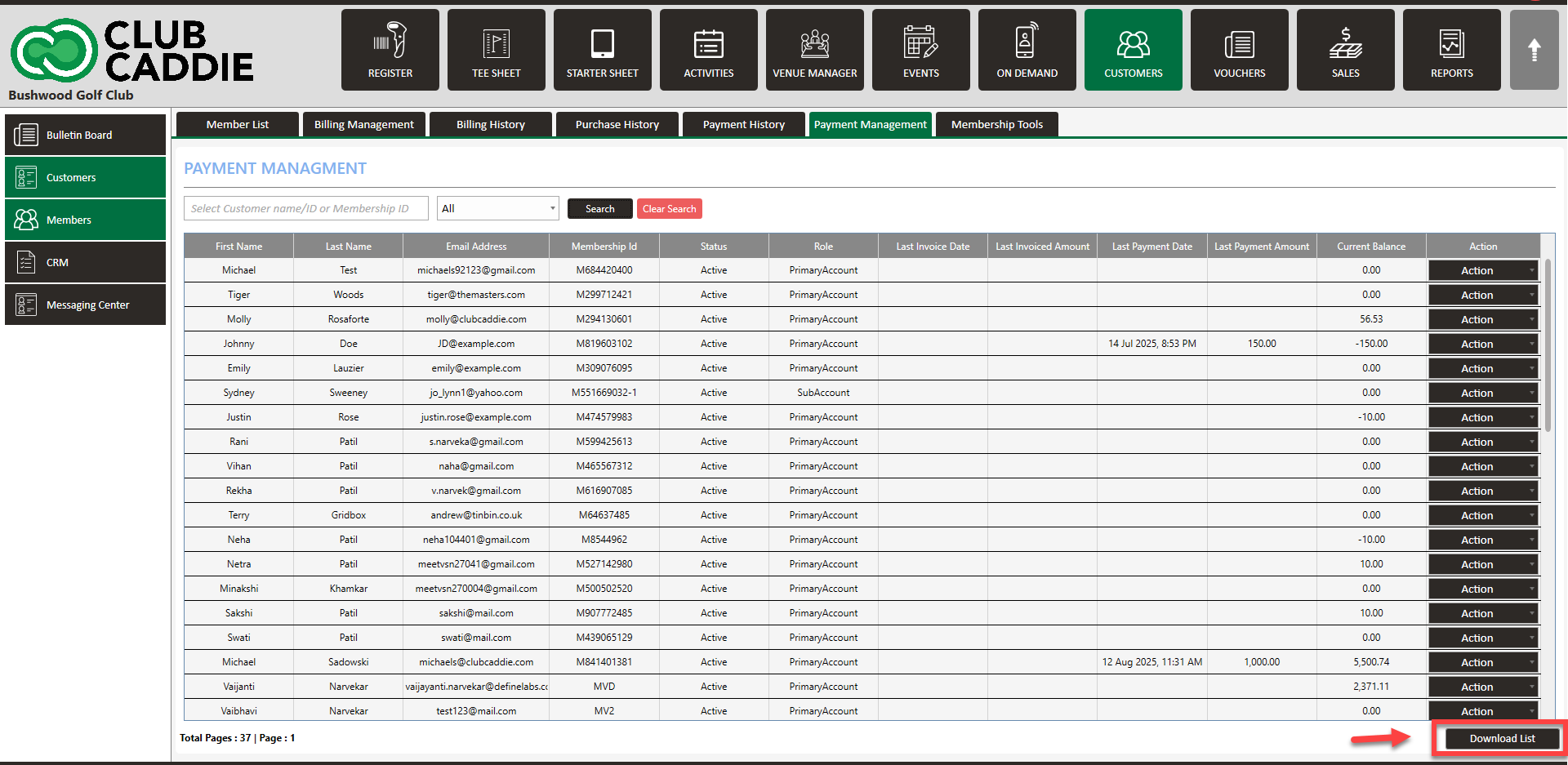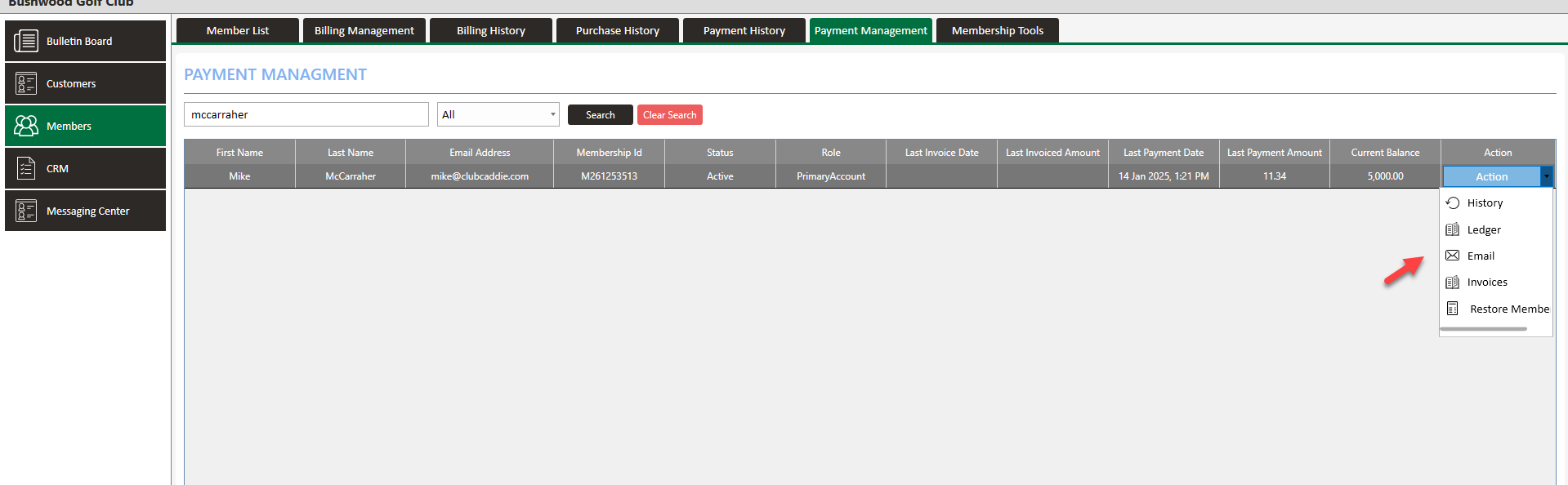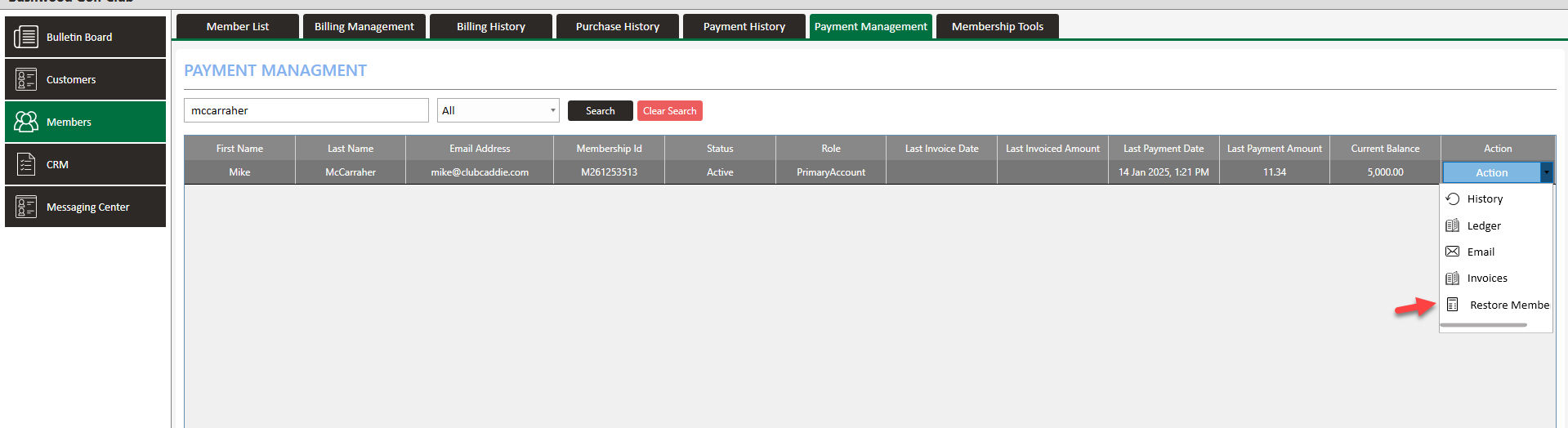 Step 2: Click on the Payment Management tab (1). Select a particular member (2) and click on Action (3). Within the Action menu you will find the following options: History, Ledger, Email, Invoices, Restore Member.