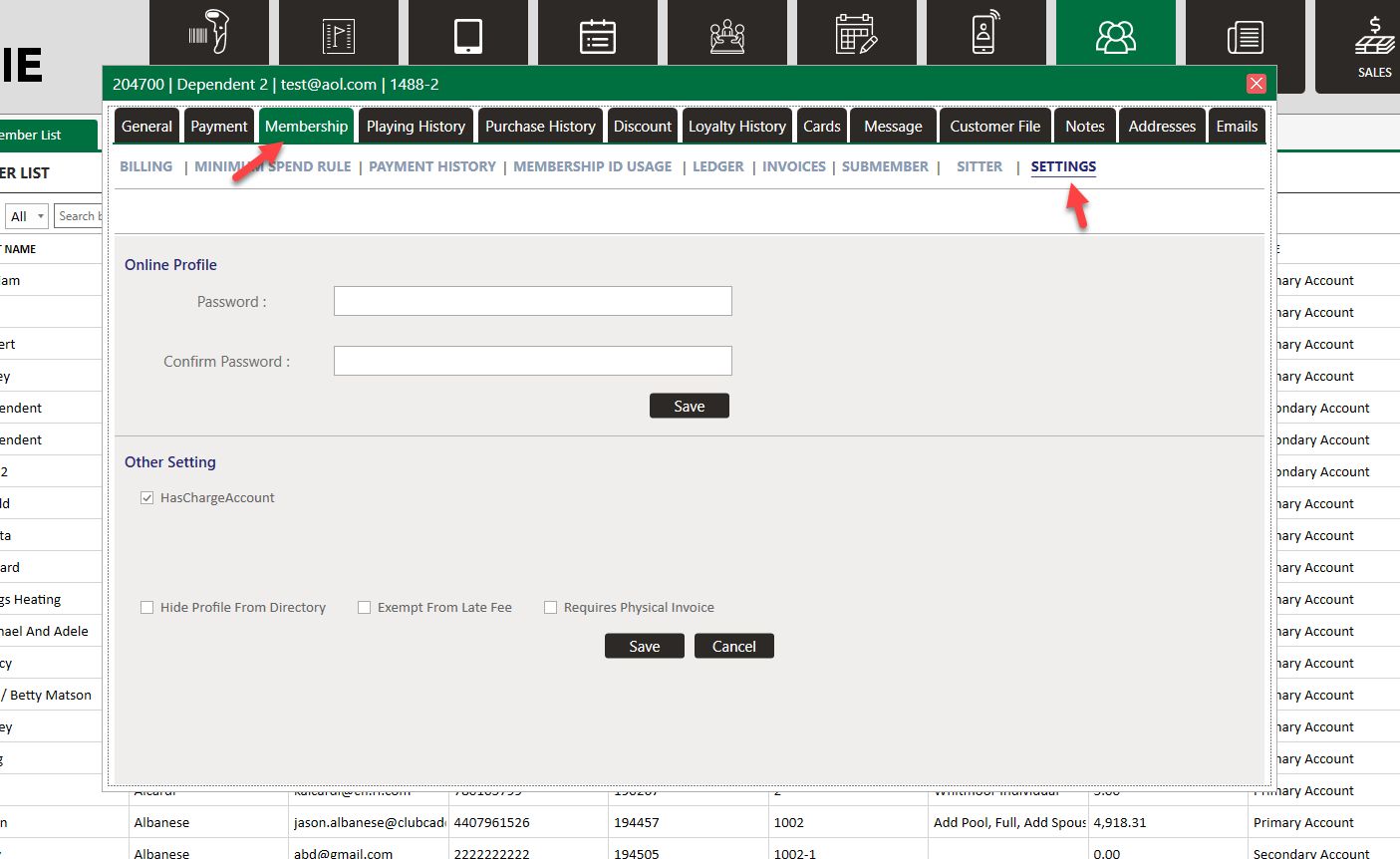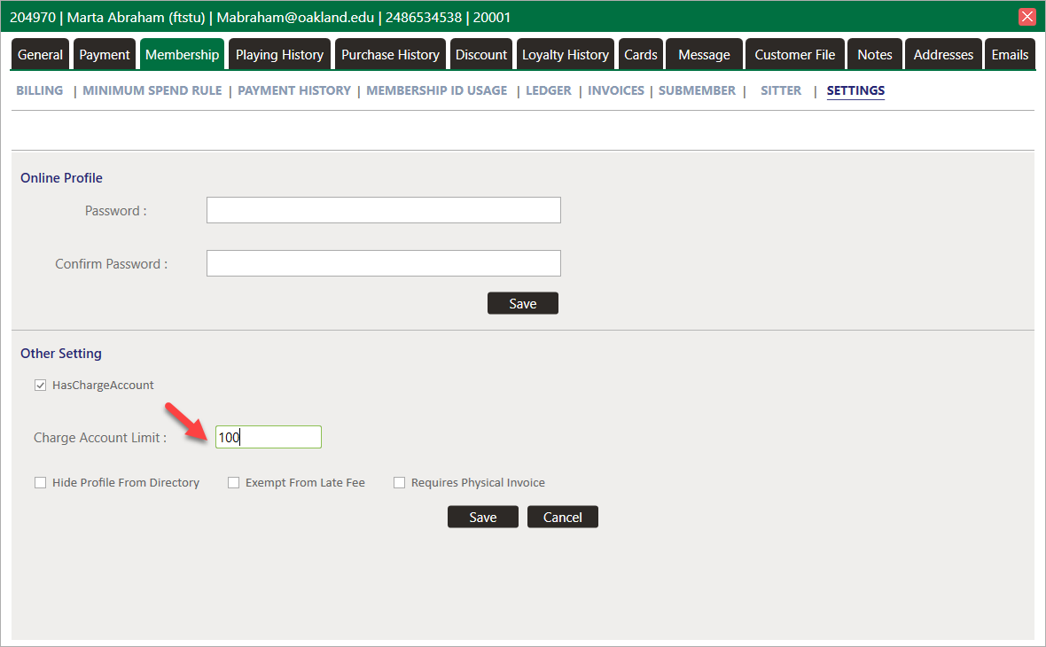Step 4: The “Has Charge Account” toggle allows you to disable or enable the member’s ability to charge amounts to their account. The “Charge Account Limit” field lets you set a dollar limit that the member’s owed balance cannot surpass. After making your desired changes, click “Save” at the bottom of the screen.