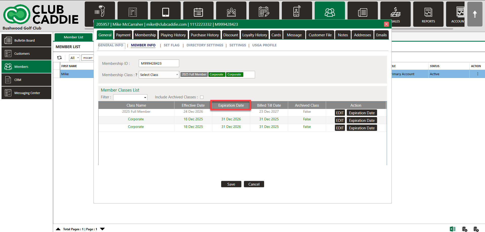 Step 1: Open the member’s account, then click the Member Info tab to access their membership details. Locate the membership class you want to review (for example, a monthly dues class), then find the Bill Till Date field for that class.