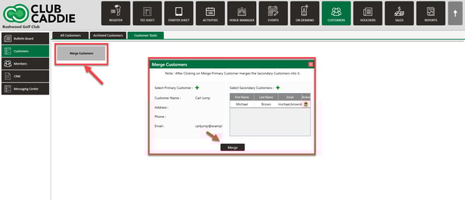 Step 3: Select Merge Customers. A pop-up will appear where you will enter the customers that you wish to merge.