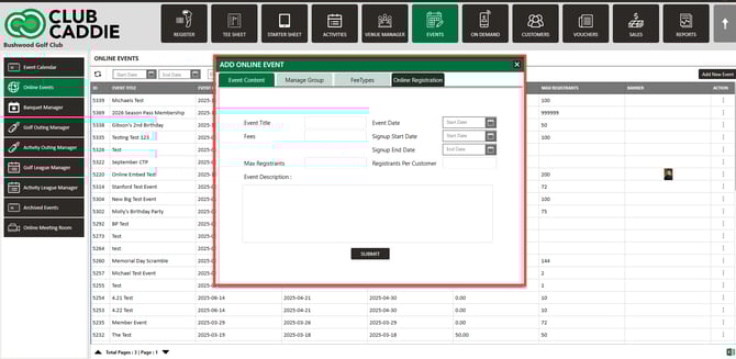 Step 3: The system will create an ADD NEW EVENT pop-up window with the new event's required information. Once the necessary information has been filled out, click the SUBMIT button to save and publish the event.