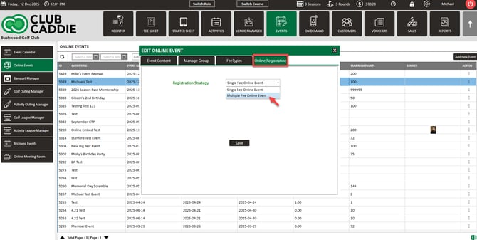 If you add multiple fee types, you will need to go to the Online Registration tab, click the dropdown, and select Multiple Fee Online Event. Click Save.