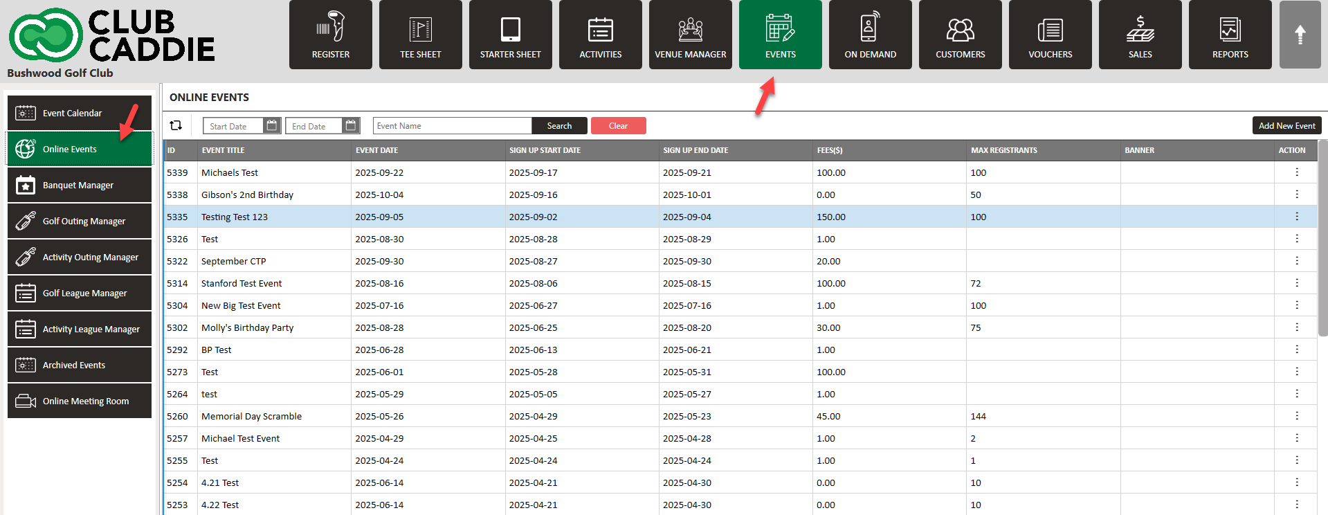 Step 1: Select the EVENTS module from the module navigation menu and then click on Online Event in the left-hand menu.