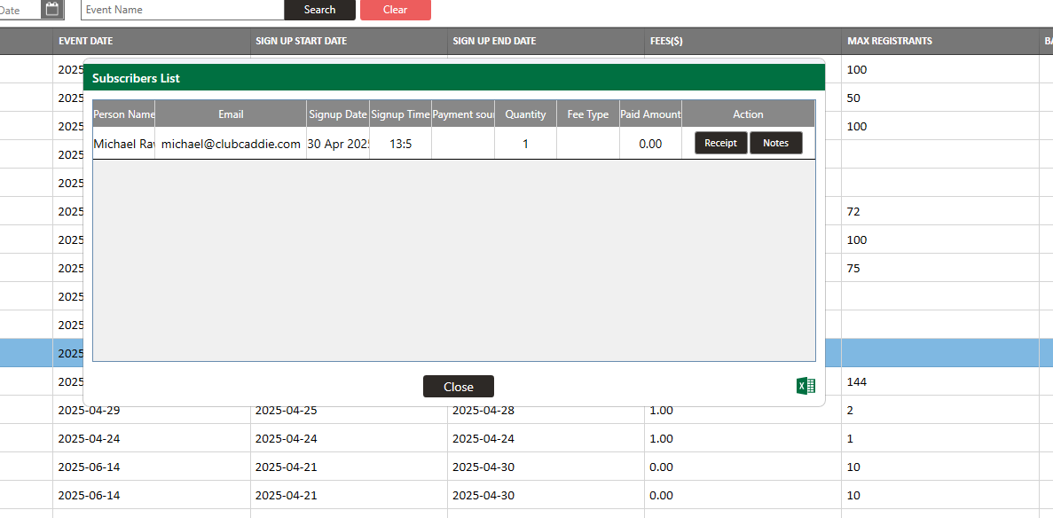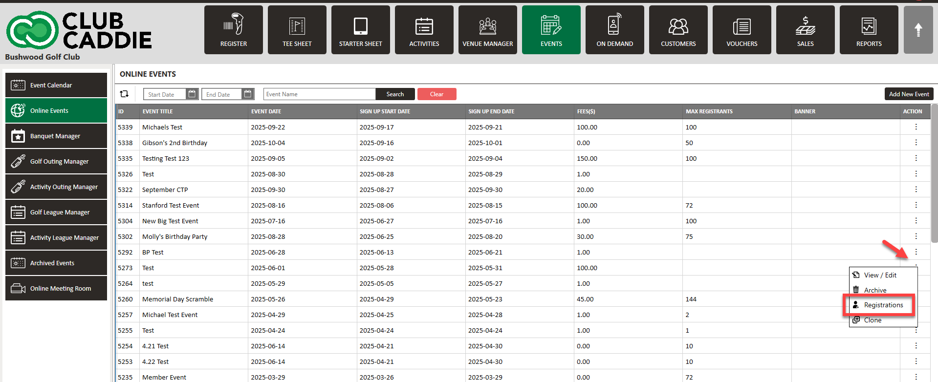 Step 2: From here, navigate to the right side of the screen where you will click on Action (three dots) on the line of the event you'd like to choose. Then click on Registrations. The window will show details of customers who have booked the event. Details that are given: Name, Email, Signup Date, Payment Source, Quantity, Paid Amount, and Notes.