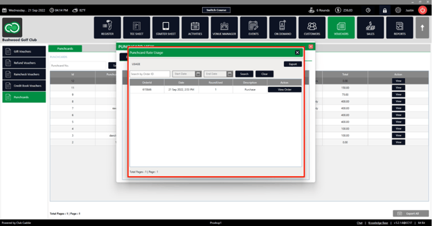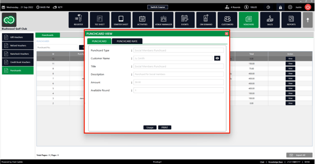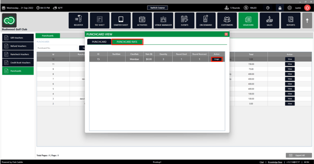 Step 3: Clicking the tab 'PUNCH CARD RATE' will allow for the viewing of a punchcard's 'Quantity', 'Rounds Used', and 'Rounds Reserved'. Clicking the 'Usage' button will display a more detailed listing of usage in a system-generated 'Punch card Rate Usage' pop-up window.