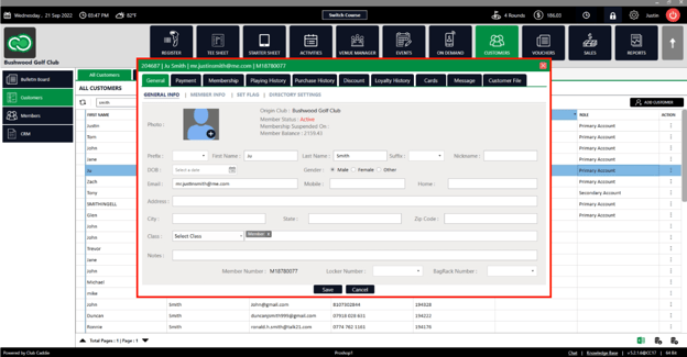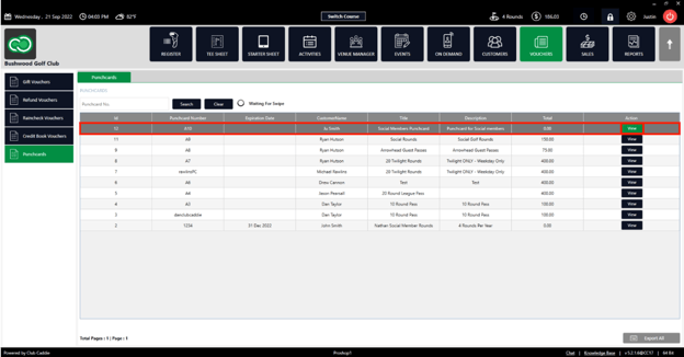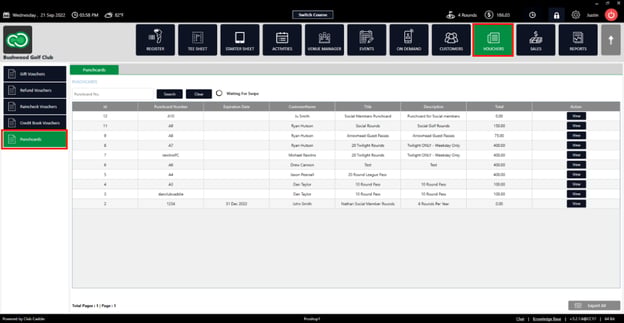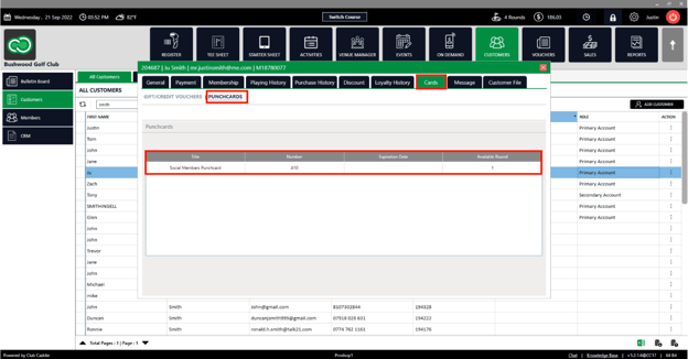 Step 3: Click 'PUNCH CARDS' which can be found under the 'Cards' tab. The 'Punchcards' window displays members’ punch cards: 'Title', 'Number', 'Expiration Date', and 'Available Rounds'.