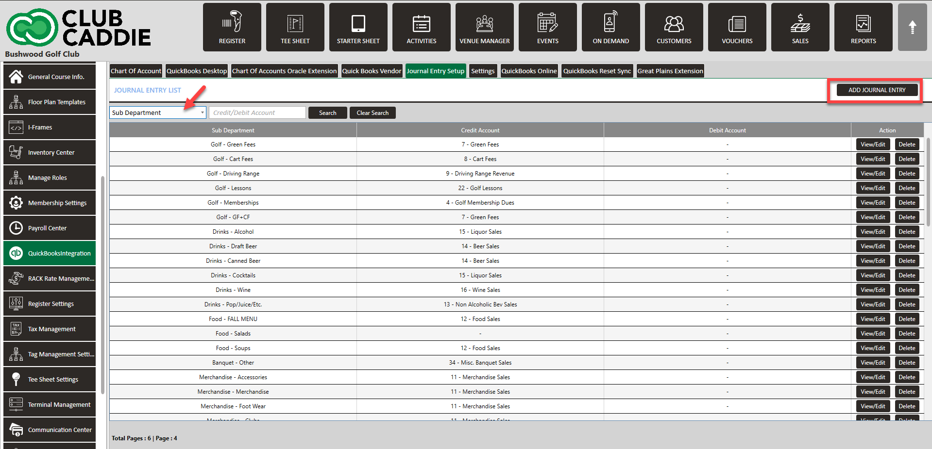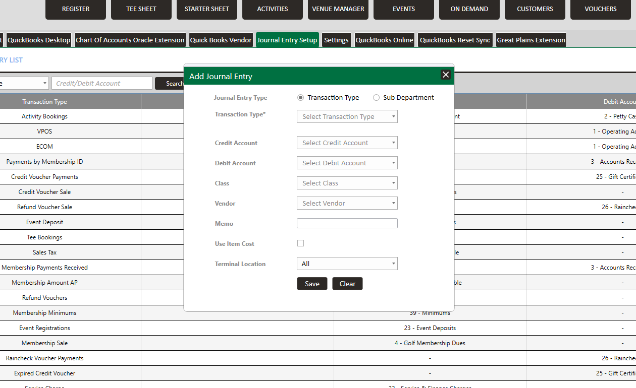Still in Journal Entry Setup, switch to the Sub Departments tab. Click Add Journal Entry (the same button, now used for sub-departments). Select the Sub Department (for example, Green Fees). Choose the appropriate Credit Account to map revenue correctly. Click Save, then repeat this process for each sub-department you need to map.