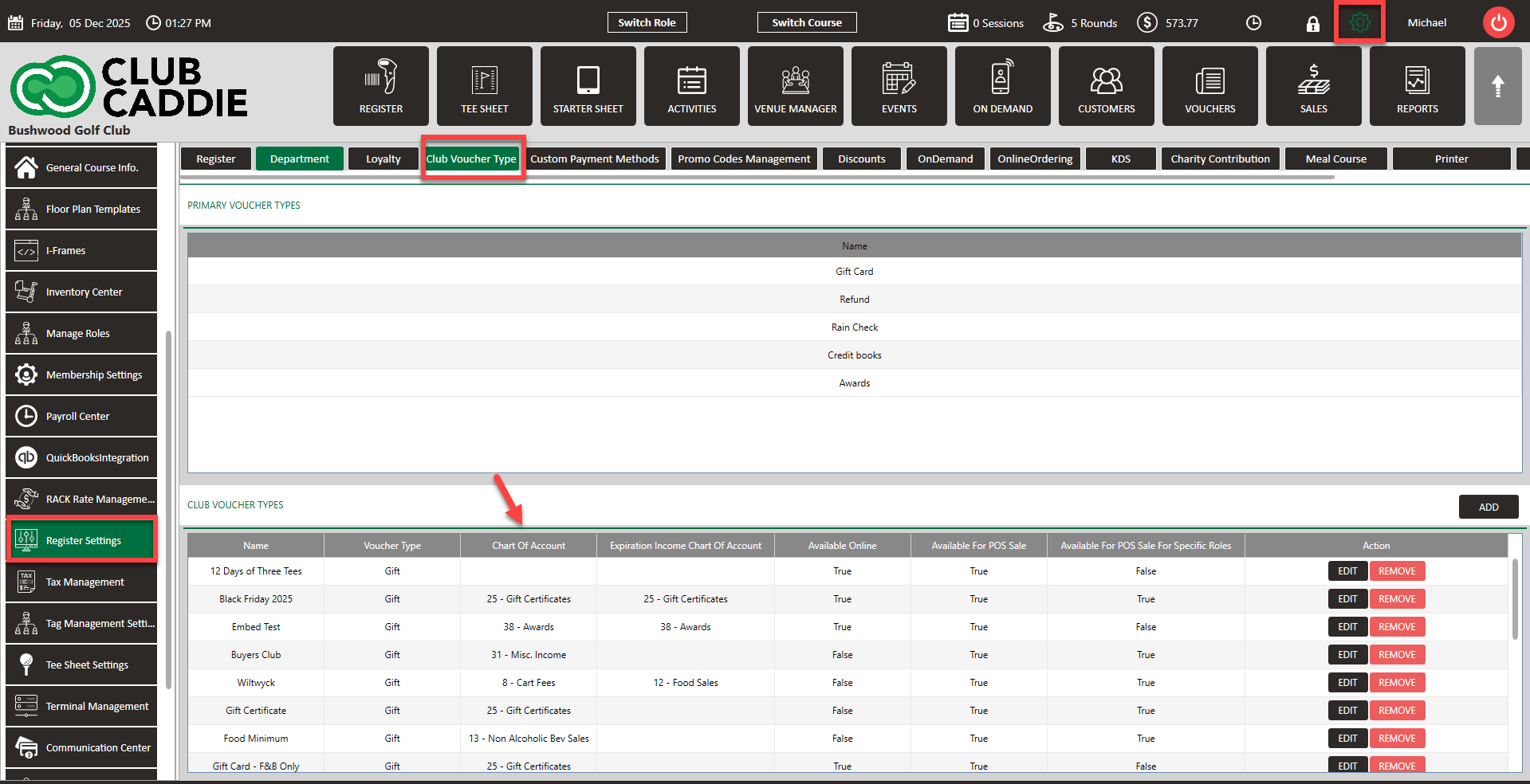 In Club Caddie, go to Settings (gear wheel), then Register Settings. Under Club Voucher Type, make sure any special vouchers are mapped to the correct GL account. Then review Custom Payment Methods and confirm that each custom payment method has an appropriate GL account assigned.