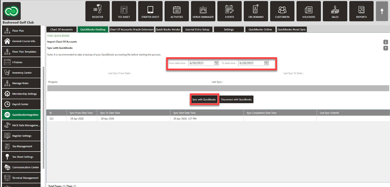 In Club Caddie, return to QuickBooks Integration. Set the Date Range for the data you want to sync, then click the Sync button. Watch the progress bar; when it reaches 100%, you should see “Sync successful.” If the sync fails, review your mappings to ensure every Transaction Type has a valid GL account and every Sub Department, voucher, and custom payment method is mapped correctly. Correct any issues you find, then run the sync again.