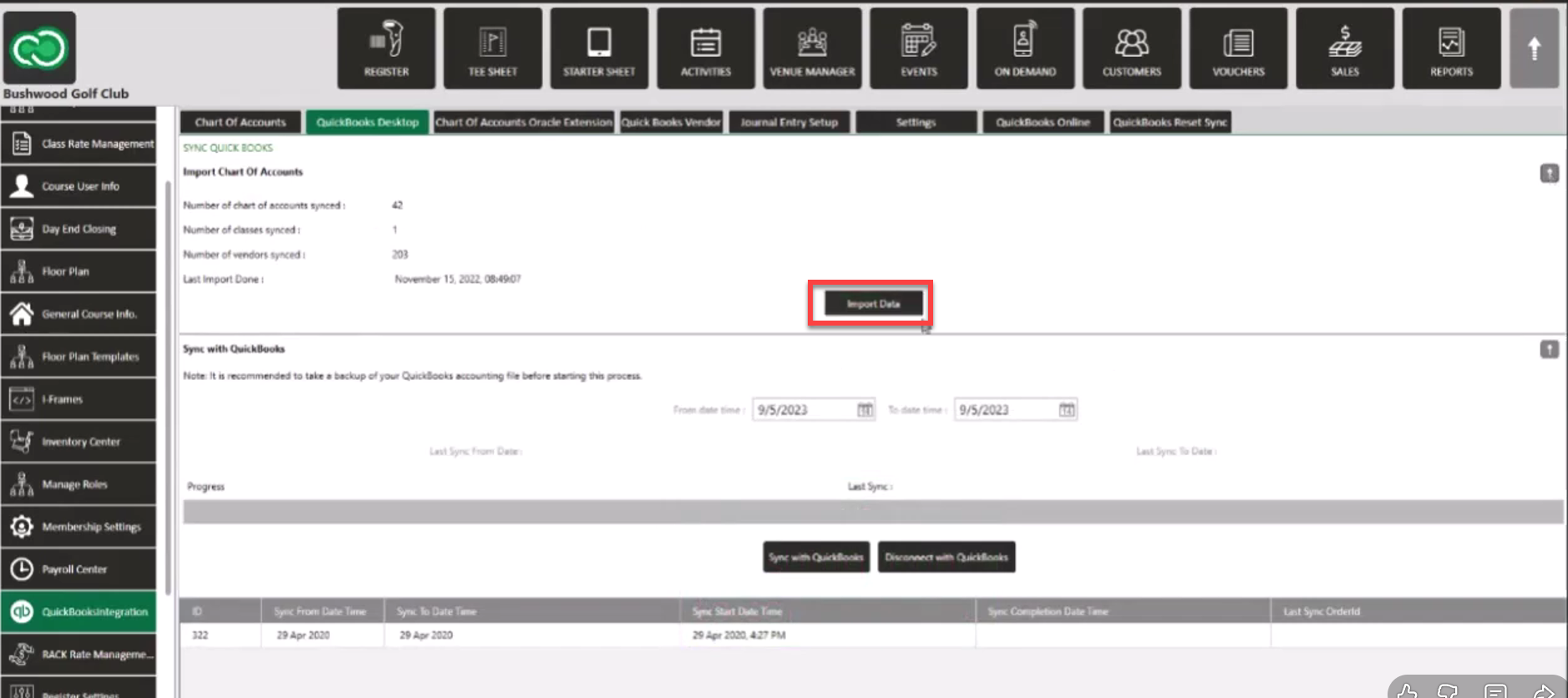 In Club Caddie, return to the QuickBooks Integration screen and click Import Data. Wait for the import to complete. Confirm that your Accounts, Classes, and Vendors have been imported (for example, “15 accounts, 4 classes, 10 vendors imported”).