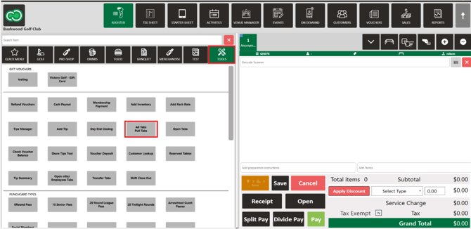 Step 2: Click on the TOOLS tab and click on the All Tabs/Pull Tabs button. The system will generate a new Pull Tabs window.
