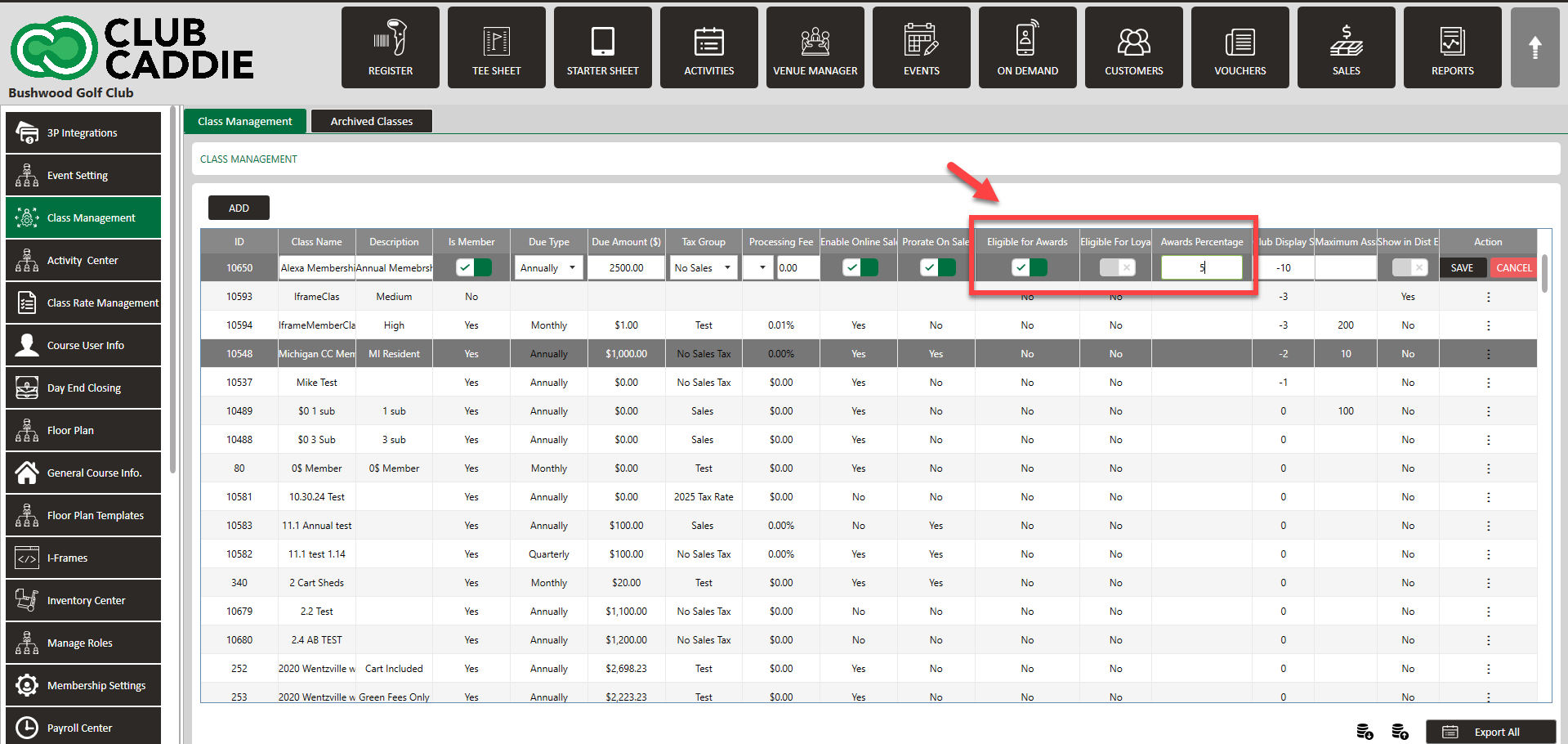 Step 4: In the class details, toggle Eligible for Awards on, then enter the Awards Percentage (this controls how much Awards credit a customer earns from the purchase), and click SAVE.