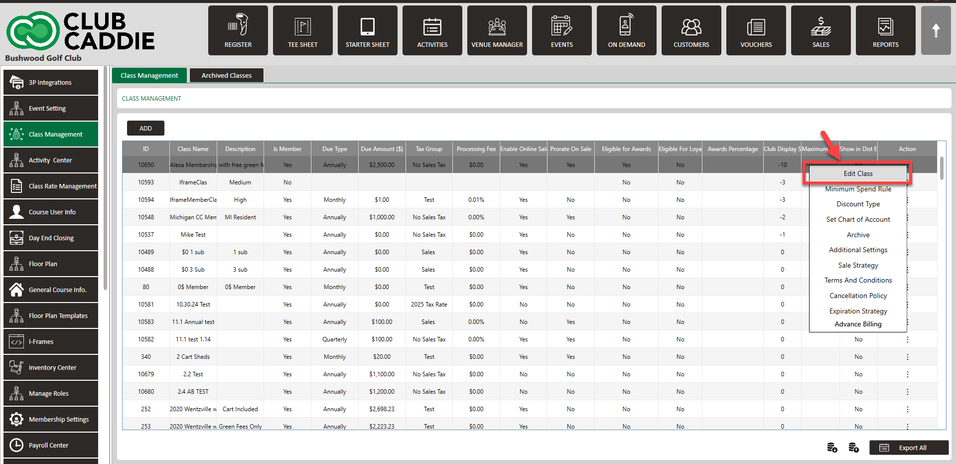 Step 3: Go to Settings → Class Management, then select Action → Edit Class for the class you want customers to earn Awards from.