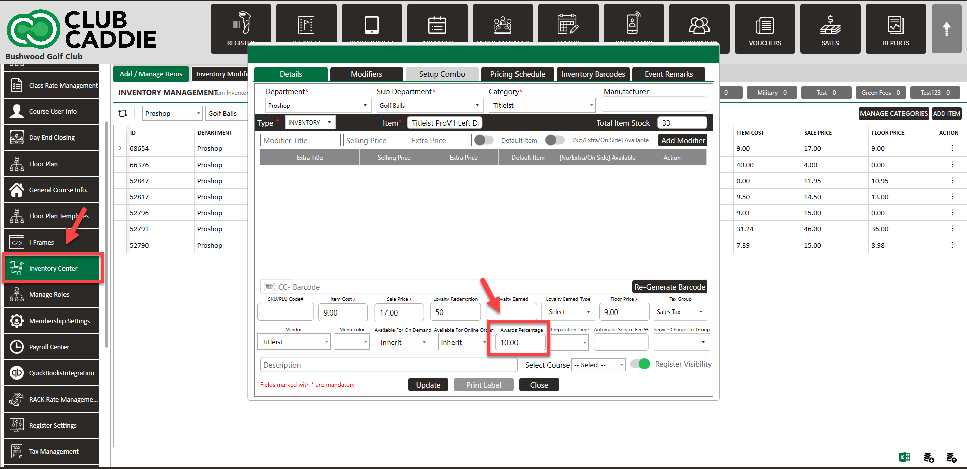 Step 5: Award percentage will need to be added at the item level in your inventory Center if you would like to reward members for item purchases: