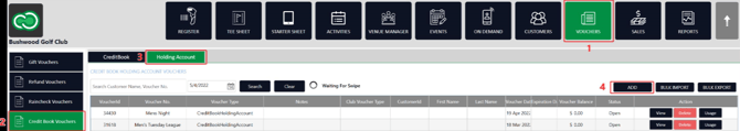 Navigate to Vouchers (1) and select Credit Book Vouchers (2), Holding Accounts (3), then select Add (4).