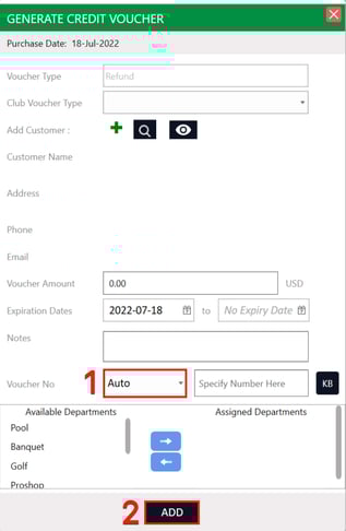 Step 2: The system will open a GENERATE CREDIT VOUCHER window to fill in Refund Voucher details. Fill in details like Name of Recipient, Voucher Amount, Expiration Date of the voucher, and Notes. The Voucher Number can be auto-generated by selecting Auto from the Voucher No. drop-down (1) or you can also create a unique voucher code by selecting specified from the drop-down. Click on ADD (2) after filling out the credit voucher details. - Note that you can select which departments you wish to have the voucher valid for (available departments/assigned departments).
