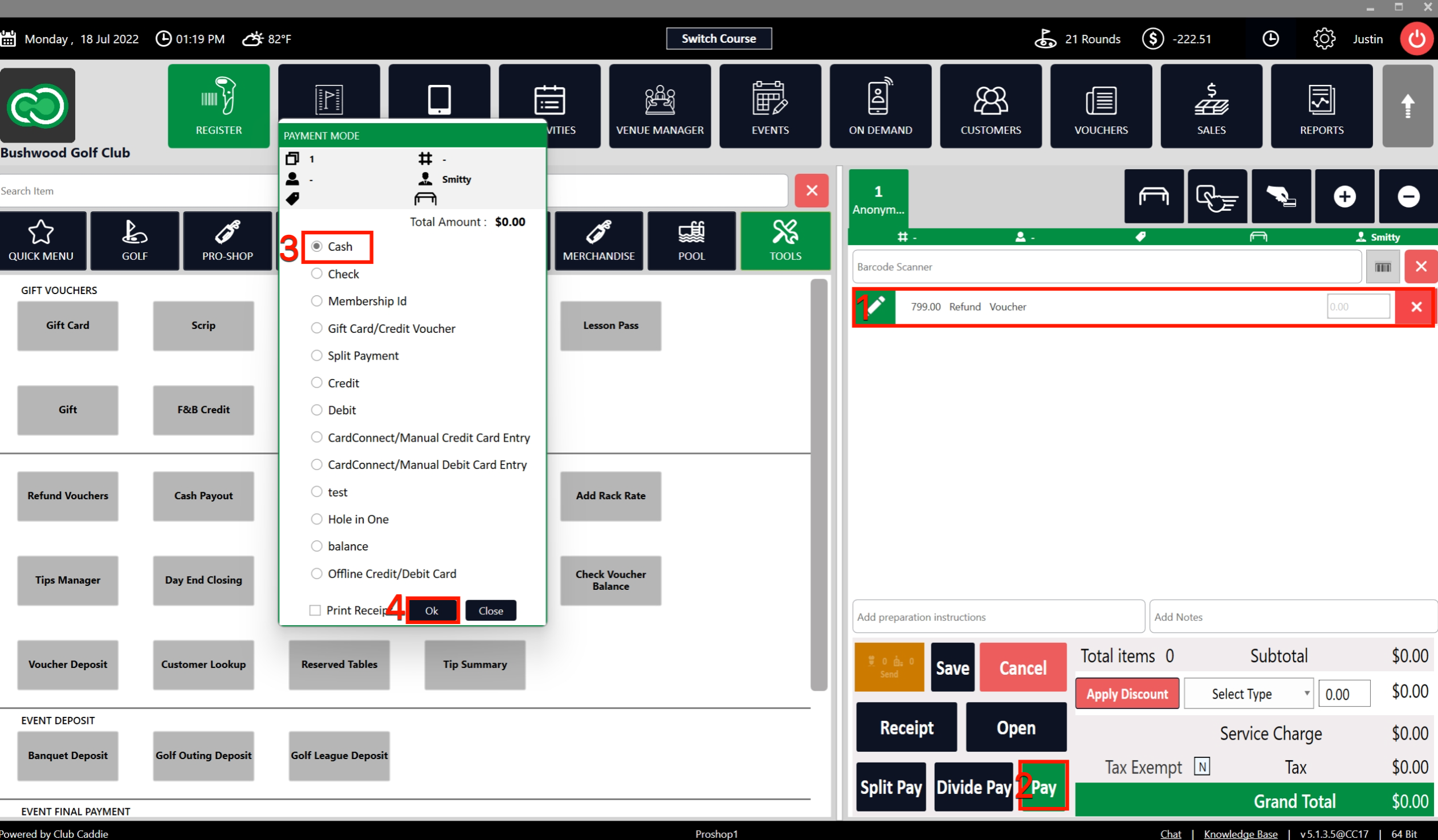 Step 3: The system will create a Refund Voucher in a new register tab (1). A payable amount will not be listed on the tab because the system will be issuing the customer a credit. Click on Pay (2) and select cash (3) from the PAYMENT MODE window and press Ok.
