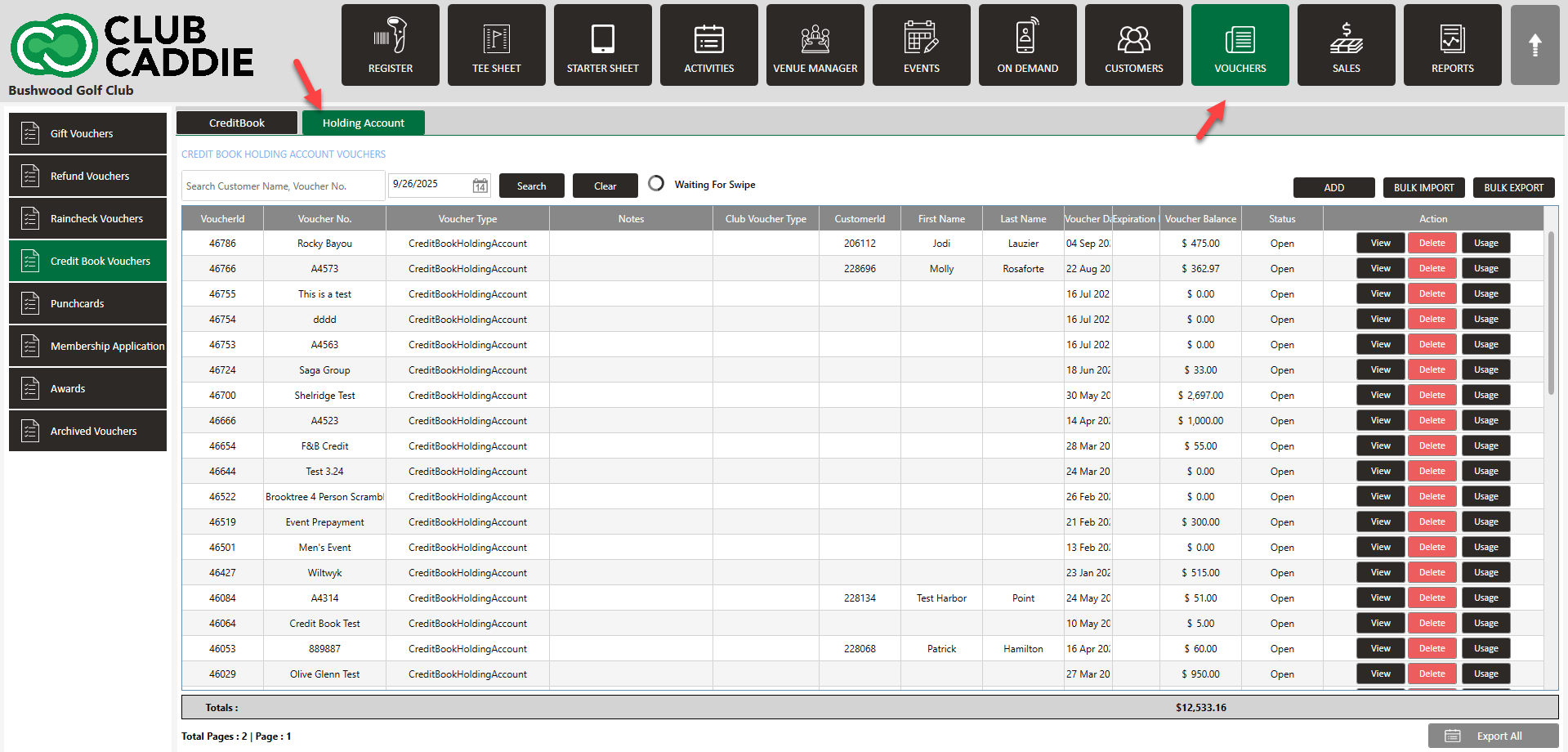 Step 5: To check the balance, usage history, or make additional edits to our newly created holding account we can navigate to the "Voucher Manager" module found in the top navigation bar. Next, select "Credit Book Vouchers" on the left-hand side and "Holding Account" in the top navigation bar.