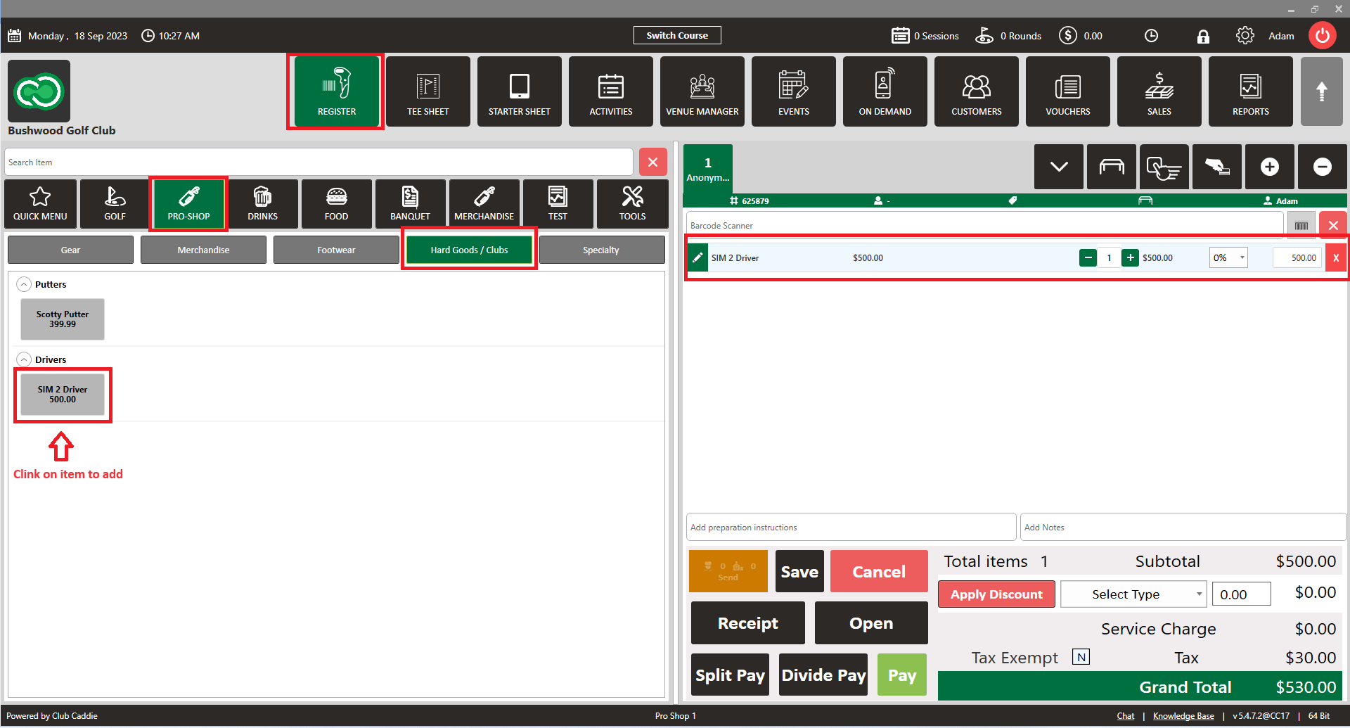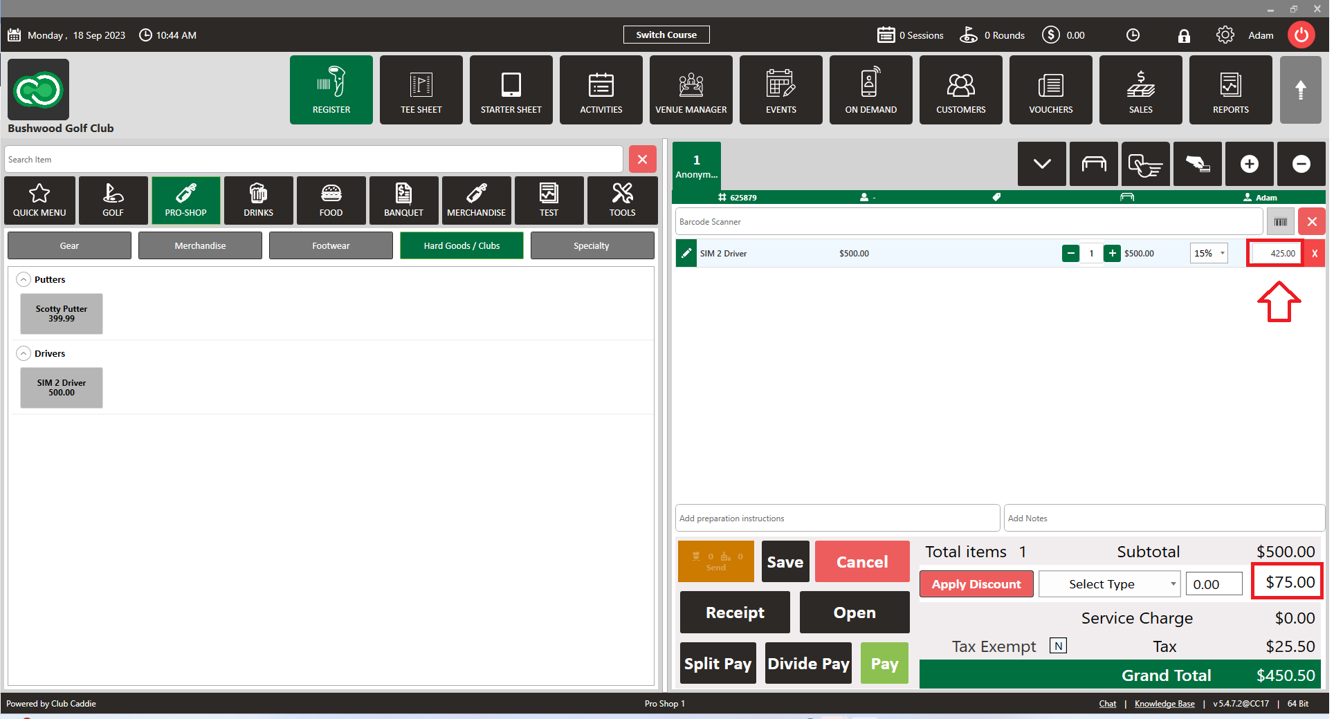 Step 2: Item prices can be edited from the register tab by selecting the amount in the price text field. Once the item prices is input, the changed amount will reflect on the register tab under the discount line.