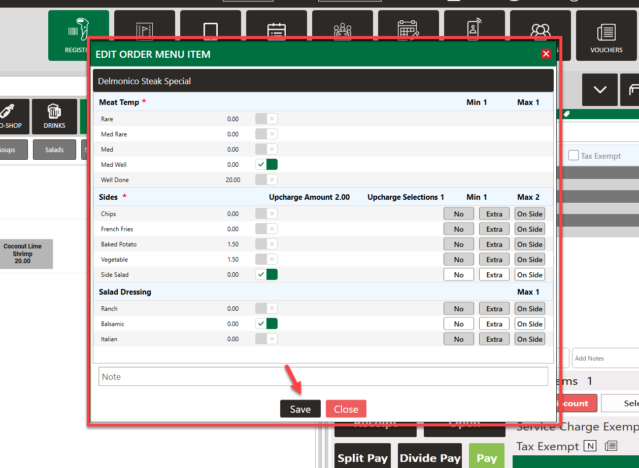 Step 2: An EDIT ORDER MENU ITEM pop-up window will open where the details of the items can be modified. Modifications can have an associated cost or without an associated cost, depending on the item. For example: add Lettuce, add Onion, add Cheese, etc. Once you are finished modifying the item, click "Save".