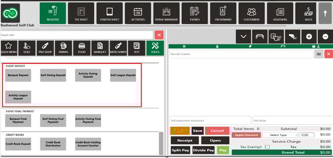 Step 2: Select the choice of Event: Banquet Deposit, Golf Outing Deposit, Activity Outing Deposit, Golf League Deposit, or Activity League Deposit. All options operate in the same manner.
