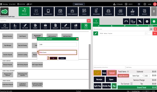 Step 3: Once the event for the deposit is chosen, the system will create a DEPOSIT pop-up. Fill in the details of the amount of the deposit and select the pre-registered event from the Select Event drop down. Then click Ok.