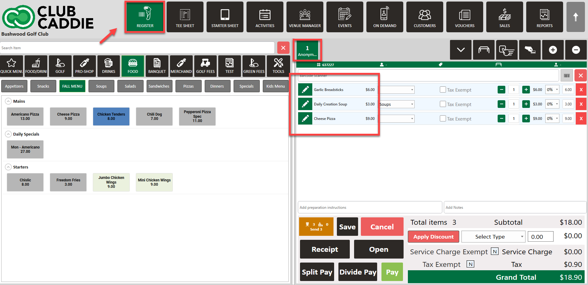 Step 1: Open the register and select the tab where you want to add items. Add the desired items (e.g., drinks and food) to the tab.