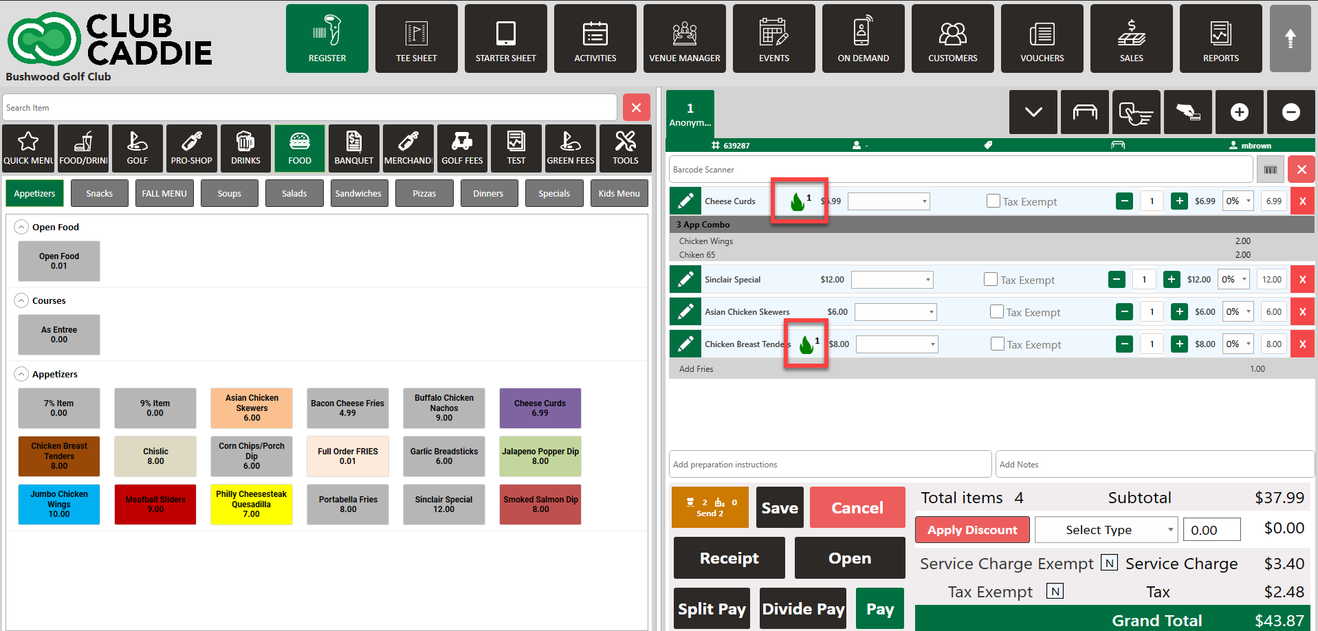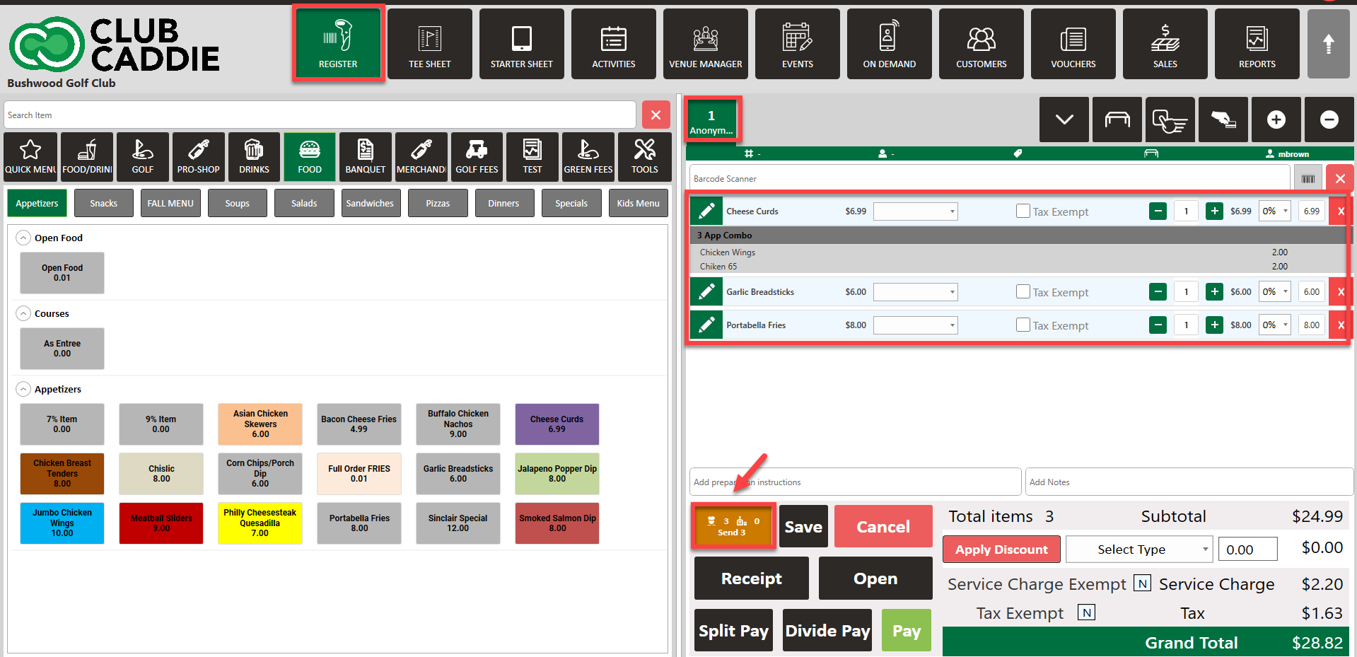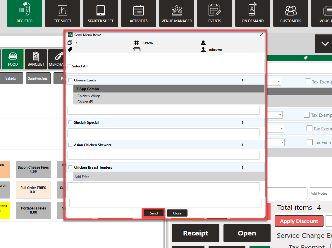Step 1: Navigate to the register and add items for the order. After adding all the items to the order, click Send.